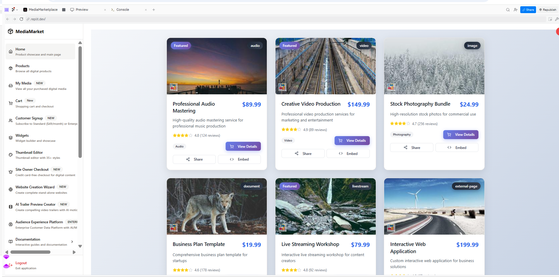 ## Core Platform Features ### Widget Builder System 1. β **Drag & Drop Interface**: Visual component placement and editing 2. β **Component Library**: Image, video, audio, text, button, PDF components 3. β **Real-time Preview**: Live preview of widget changes 4. β **Inline Editing**: Direct property modification 5. β **Responsive Design**: Mobile-friendly widget layouts 6. β **Export System**: WordPress, Joomla, Google Sites integration 7. β **Custom CSS**: Advanced styling capabilities 8. β **Animation Support**: CSS animations and transitions 9. β **Widget Showcase**: Comprehensive widget display and management ### Media Management 10. β **Multi-format Support**: Images, videos, audio, PDFs (50MB limit) 11. β **Batch Upload**: Multiple file upload with progress tracking 12. β **Automatic Thumbnails**: Generated for images and videos 13. β **Media Library**: Centralized asset management 14. β **Search & Filter**: Find media by type, name, or tags 15. β **Metadata Management**: Title, description, tags, categories 16. β **File Optimization**: Compression and format conversion ### Template Editor System 17. β **35 Unique Templates**: Including Holographic Prism, Aurora Borealis, Steampunk Gears, Plasma Energy, Marble Luxury, Neon Synthwave, Origami Paper, Liquid Metal, Galaxy Storm, Fire Dragon, Voodoo Magic, Disco Fever, Toxic Waste, Candy Explosion, Dragon Scales, Electric Storm, and 19 more 18. β **Template Categories**: Modern, Classic, Creative, Minimal, Premium 19. β **Live Preview**: Real-time template customization 20. β **Responsive Modes**: Desktop, tablet, mobile previews 21. β **Custom Branding**: Logo, colors, fonts integration 22. β **CSS Animation Effects**: Advanced visual effects 23. β **Theme Switching**: Easy template switching 24. β **Template Export**: Export templates as JSON files with versioning ### Site Templates System 25. β **Industry-Standard Templates**: 8 professional website templates 26. β **Template Categories**: Movie Site, Music Site, E-Book Site, Seminar Speaker Site, Program Sign-up Site, Stock Media Site, Audio Clip Site, E-Learning Site 27. β **Custom Color Schemes**: Industry-appropriate color palettes 28. β **Template Management**: Create, edit, and customize templates 29. β **Template API**: Server-side template storage and retrieval 30. β **Template Preview**: Live preview with customization options 31. β **Template Export**: Export templates for deployment ## Product Management ### Product Types 32. β **Video Products**: Streaming video with player controls 33. β **Audio Products**: Music, podcasts with visualizers 34. β **Audio EP Products**: Complete audio albums with playlist creation wizard (up to 30 tracks) 35. β **Image Products**: High-resolution images with protection 36. β **PDF Products**: Digital documents and ebooks 37. β **Live Video Products**: Real-time streaming integration 38. β **Private Pages**: Exclusive content with signup requirement 39. β **Site Pass Products**: Universal access to all content 40. β **Meeting Products**: Video conferencing integration 41. β **Consultation Products**: Booking system integration 42. β **External Page Products**: Secure iframe embedding of external URLs ### Product Showcase 42. β **Grid View**: Thumbnail grid with hover effects 43. β **List View**: Detailed product listings 44. β **Search & Filter**: Category, type, keyword filtering 45. β **Sorting Options**: Price, date, popularity, rating 46. β **Featured Products**: Highlight special products 47. β **Rating System**: 5-star rating with reviews 48. β **Purchase Statistics**: Views, purchases, revenue tracking 49. β **YouTube-like Thumbnails**: Animated hover effects 50. β **YouTube-Style Video Preview**: Hover-activated video previews with animated loading dots 51. β **Audio Visualizers**: Dynamic audio visualization for audio products 52. β **External Page Products**: Secure iframe embedding of external URLs 53. β **Modal Popups**: Shadow-box modal integration for media display 54. β **Navigation Menu System**: Comprehensive hierarchical navigation with 25+ pages ### Audio EP System 55. β **Audio EP Products**: Complete audio albums with up to 30 tracks per EP 56. β **Playlist Creation Wizard**: Step-by-step audio album creation process 57. β **Multi-Track Support**: Upload and manage up to 30 audio files per EP 58. β **Audio Visualizers**: Real-time visual effects (bars, waveform, circular) 59. β **Playlist Management**: Drag-and-drop track ordering and organization 60. β **Album Art Integration**: Cover art display with track thumbnails 61. β **Playback Controls**: Play, pause, skip, shuffle, repeat functionality 62. β **Track Information Display**: Artist, title, duration for each track 63. β **Progress Tracking**: Seek bar and time display with position control 64. β **Volume Control**: Adjustable volume with mute option 65. β **Visualizer Customization**: Choose from bars, waveform, or circular displays 66. β **Layout Options**: Sidebar, bottom, or top playlist arrangements 67. β **Demo Audio EP**: "Dreamscapes Collection" with 9 original compositions 68. β **AudioEpPlayer Component**: Dedicated React component for EP playback ### Media Players 69. β **Universal Media Player**: 11 different player integrations 70. β **Video.js**: Open-source HTML5 video player 71. β **JW Player**: Professional video hosting 72. β **Bitmovin**: Adaptive streaming player 73. β **Plyr**: Simple, accessible media player 74. β **THEOplayer**: Premium video player 75. β **Kaltura**: Enterprise video platform 76. β **Vimeo Player**: Vimeo integration 77. β **Projekktor**: HTML5 video player 78. β **Flowplayer**: Commercial video player 79. β **Clappr**: Extensible media player ## E-commerce & Payment System ### Payment Processors 66. β **PayPal Integration**: Complete checkout system 67. β **Stripe Integration**: Credit card processing with 3D Secure 68. β **Square Integratio